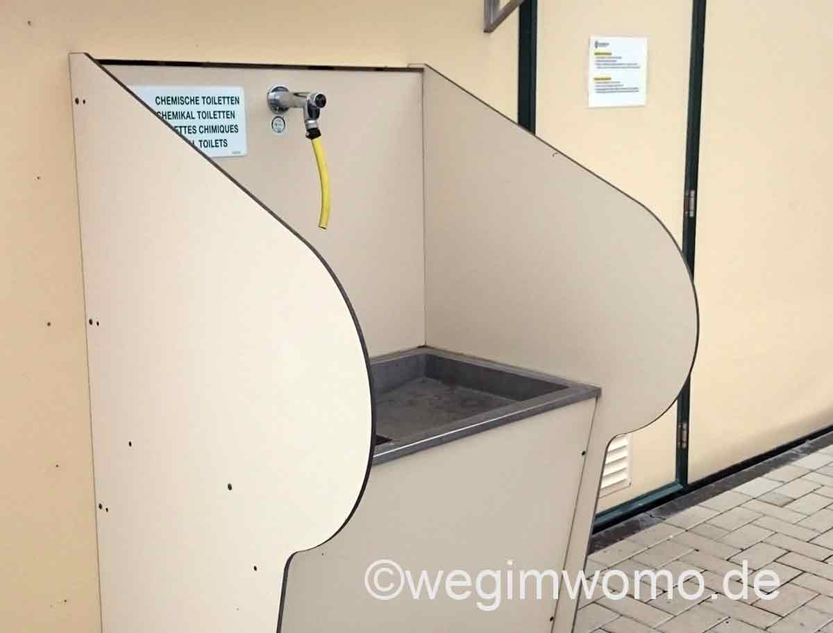 Links neben der Einfahrt ist der Bereich, wo das Grauwasser abgelassen werden kann. Eine große betonierte Fläche mit einem gut abgesenktem Gulli in der Mitte. Das Grauwasser kann also nur in den Abfluss laufen und nicht irgendwo daneben. Leider sind die Bodeneinlässe nicht immer so durchdacht. Hier ist eine weitere Möglichkeit vorhanden, um die Toilettenkassette zu leeren. Auf der gegenüber liegenden Seite ist eine Säule zur Wasserversorgung.