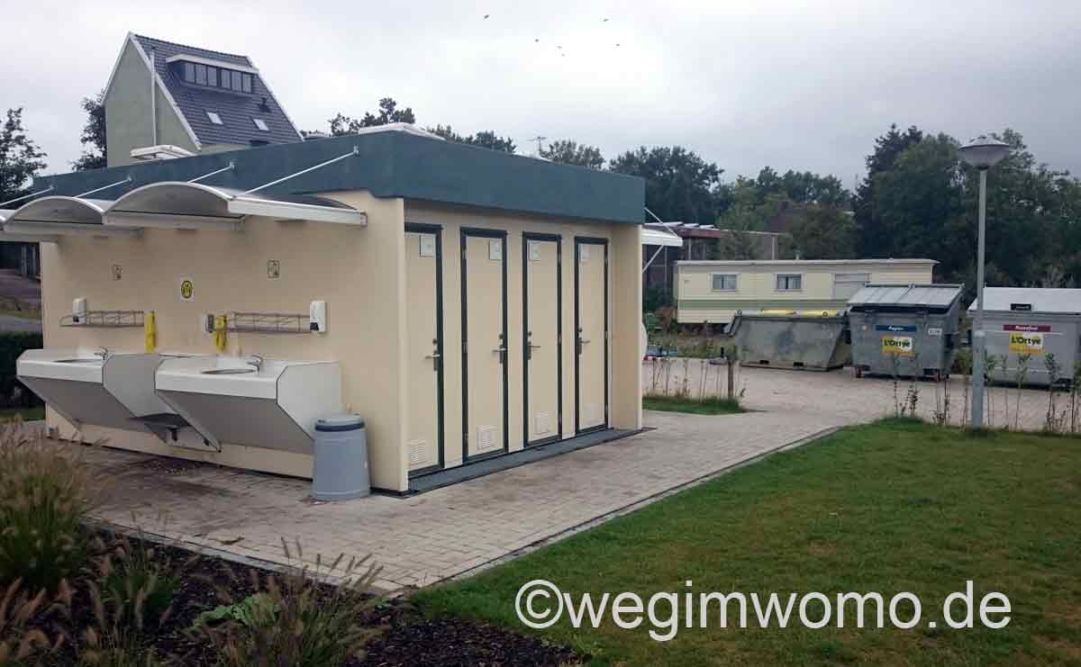 Der Stellplatz ist schon eher wie ein Campingplatz ausgestattet. Der Stellplatz hat ein frei stehendes Gebäude mit drei Duschen und zwei Herren- bzw. Damentoiletten. Zudem hat dieser Bau noch vier Waschbecken (Geschirr) an den Außenwänden, wie auch einen separaten Ausguss für die Chemietoilette an der hinteren Außenwand. Dieses Gebäude befindet sich vom Platz aus gesehen rechts neben der Einfahrt.